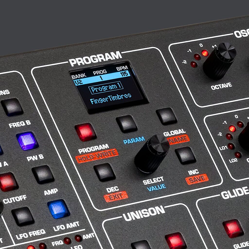 坚守 100% 纯模拟信号路径,深度复刻 Prophet-5 架构与包络响应曲线。每声部 2 个 Prophet-5 Rev 2 同源振荡器,支持多波形选择、同步及 PWM 调制,搭配三种噪声类型与复古模式,音色层次丰富。4 极低通谐振滤波器带低音补偿,高共鸣下低频依旧饱满,强激励反馈电路兼顾复古温润与现代冲击力,适配多元曲风。